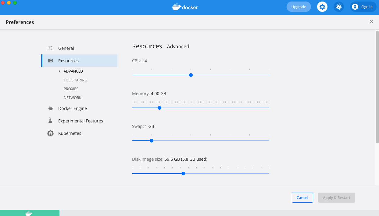 할당된 메모리를 늘려서 Docker를 재시작합니다.